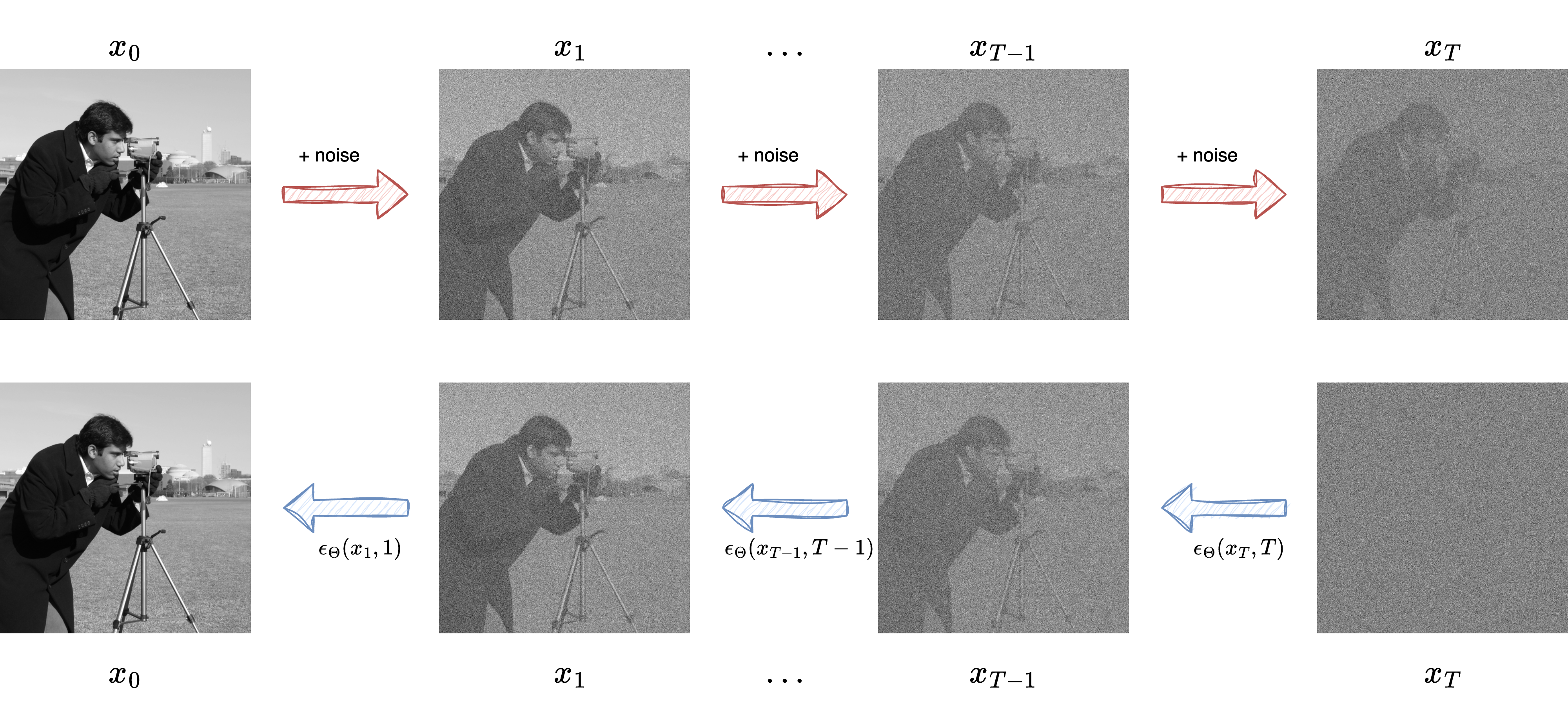 Reverse process: learns to remove noise step-by-step