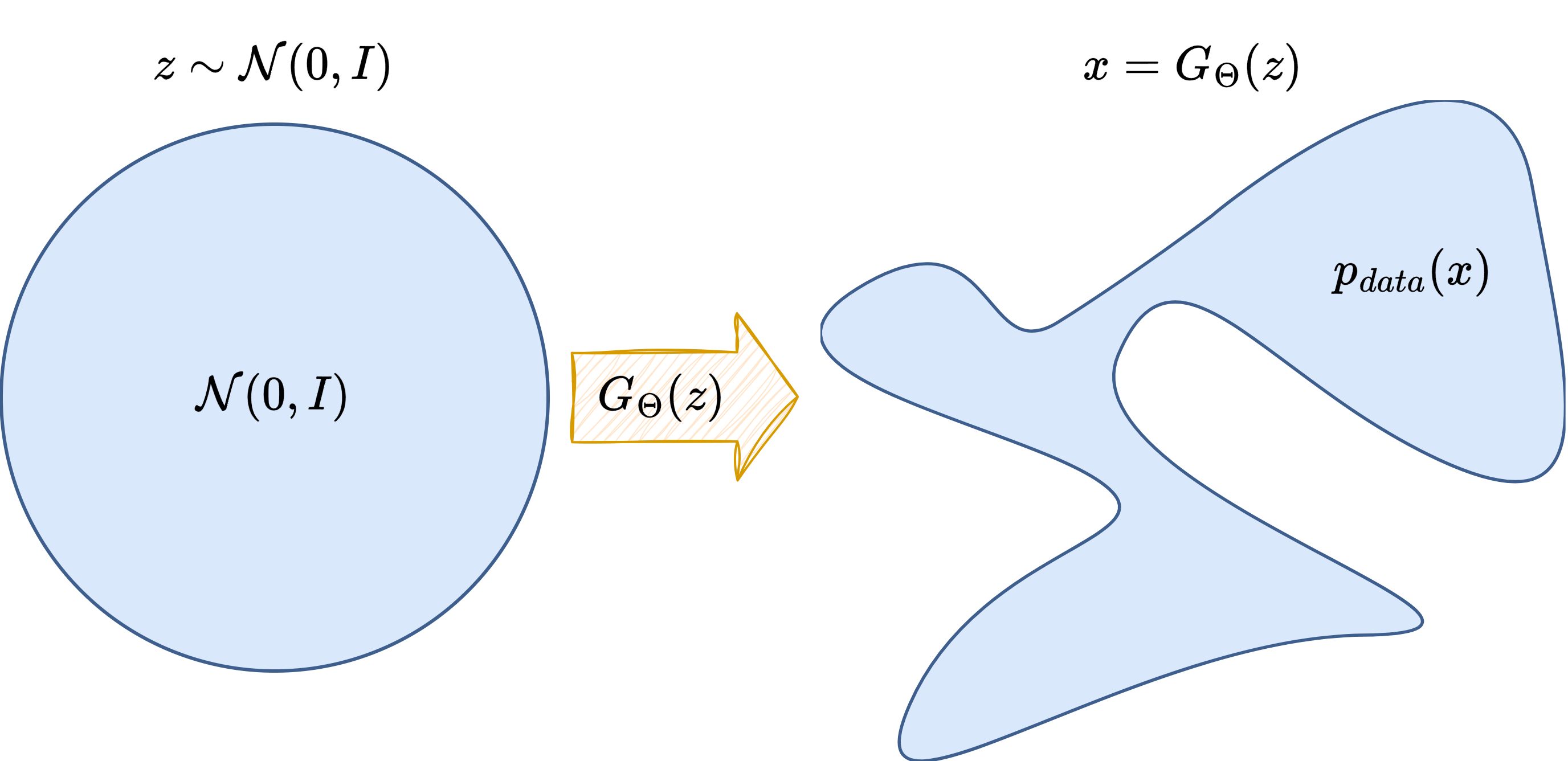 Here, \(G_\theta\) is a neural network called the generator, mapping the latent space to the data space.