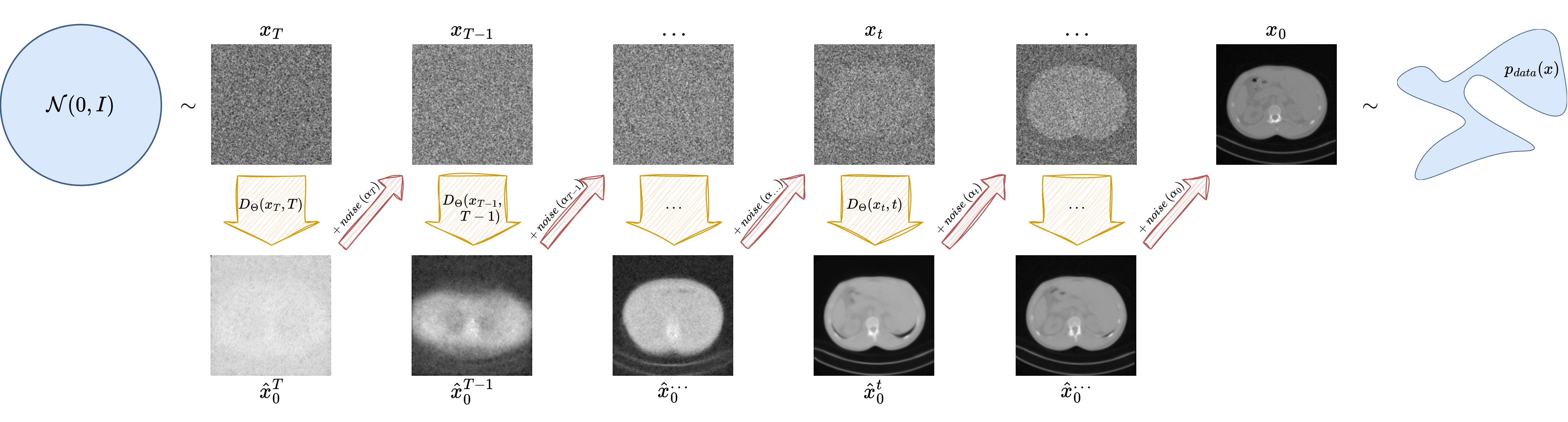 Given a trained model \(\epsilon_\theta(x_t, t)\), we start from \(x_T \sim \mathcal{N}(0, I)\) and apply the following iterative update: