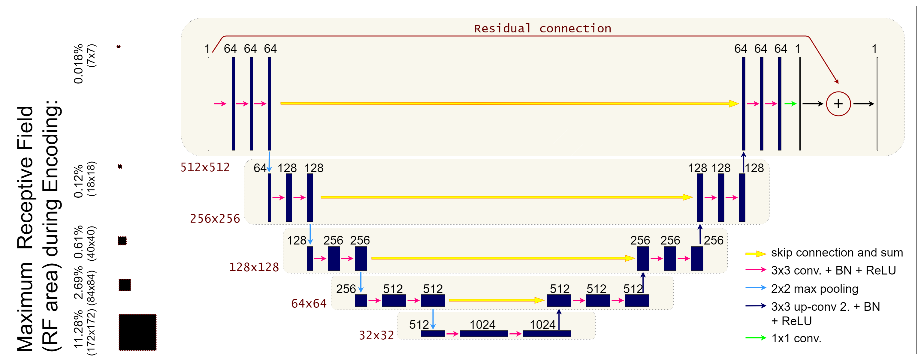 This equation shows that the receptive field scales linearly with the depth of the network if the kernel dimension is fixed, while it is exponentially related to the stride. For this reason, utilizing strided convolutional layers exponentially enlarges the receptive field of the model.