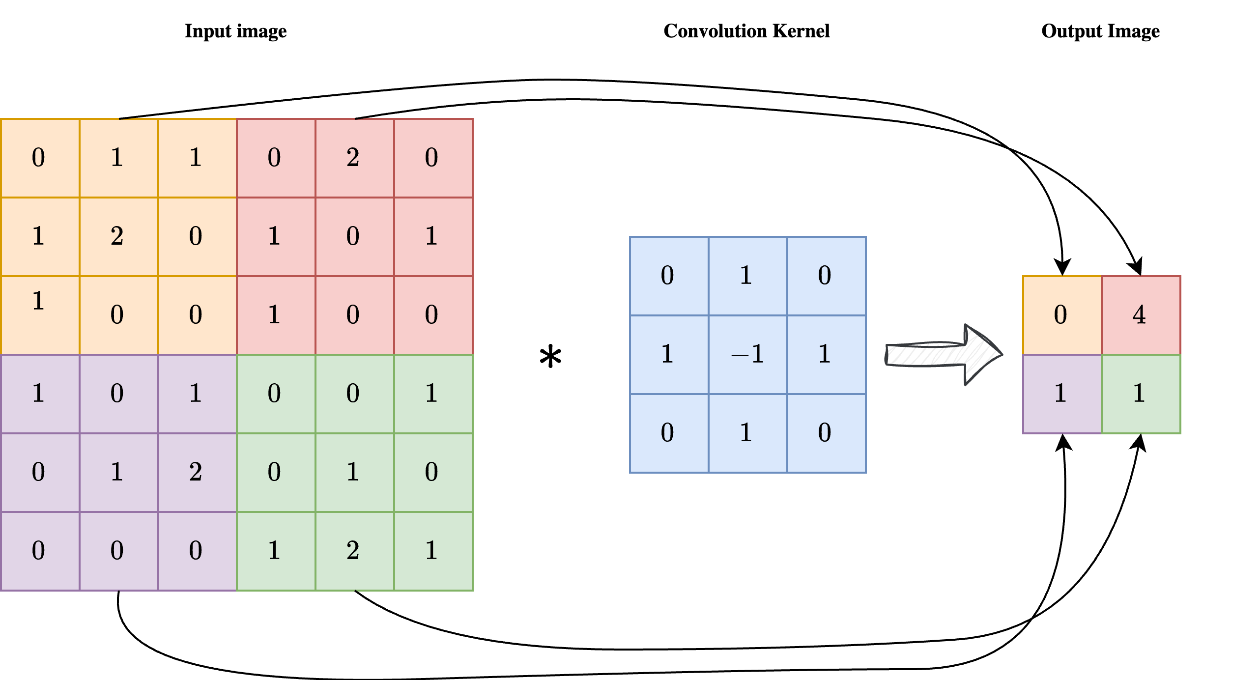 As shown in the image above, a convolution is a linear operation involving an input image \(x\) with shape \(n_x \times n_y\) and a convolution kernel \(\mathcal{K}\), with shape \(k \times k\), usually much smaller than the dimension of the image. Each pixel in position \((i, j)\) of the output image \(y = \mathcal{K} \ast x\) is obtained by applying the center of the kernel to the pixel \((i, j)\) of the input image, then element-wise multiplying the convolution kernel with the corresponding pixels of the input image, and summing the result. In formula: