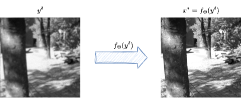 Note that, compared to the classical notation we used previously, here we consider the training pair as \((y^{(i)}, x^{(i)})\) instead of \((x^{(i)}, y^{(i)})\). This is because the network should take as input the corrupted image \(y^{(i)}\) and return a reconstructed solution \(x^{(i)}\).